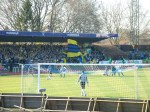 The stadium was a typical Danish lower league affair – a municipal stadium meaning it had an annoying athletics track which does nothing but to hamper the view. The rest of the stadium was quite unique and gave the arena a homely feel. Behind each goal were steep grass banks with a few rows of concrete steps. These had filled up with fans drinking beer and enjoying the sunshine as if they were at a concert or simply enjoying a Sunday afternoon in the park. In one corner was a clubhouse which had a large balcony full of fans like some modern day Craven Cottage. The main stand was simply a steep few rows of terrace with a roof, but home to the Lyngby fans. Opposite the main stand was a smaller stand which was full with Brondby fans singing their English songs (“You’re not singing anymore” was a favourite, despite the fact the home fans were singing!). The ground had been split down the middle with the Brondby fans out numbering the home fans by 2 to 1. They certainly kept up the tempo during the open exchanges. It was also a good opportunity to see Brondby’s strange chocolate brown and sky blue kit – not a combination of colours you would normally put together but in this instance it worked well.