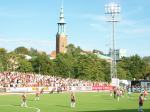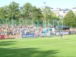 The Valhalla was a 5 minute walk from the hotel, and with an average 2nd division game due to start at 6pm we didn’t leave until 5.45pm. The stadium certainly sounded busy when we walked along the road – very impressive for a club that normally average just over 1,000 fans. Queues were stretching down the road, and it seemed that we had stumbled on a game that had some meaning – in fact, as my Swedish translation skills kicked in (OK – a bloke in front of me told me in English) that the game was a complete sell out – the first in over a decade at the Valhalla. The reason was one of those stories that rarely reach the media – similar to Aston Villa’s last game of the season in May 2008 when they visited Upton Park to play West Ham when Oluf Mellburg was playing his last ever game for Villa. In an amazing gesture he bought every single – yes over 3,500 fans – a replica shirt. Yes – the shirts were going to be replaced, yes he probably got a discount but even if they cost him a £5 he stumped up over £17,000 out of his own pocket. How many Premier League footballs would donate a 10th of that? Anyway, back in Gothenburg and the reason for the huge crowd was that Marcus Allback, ex-Aston Villa and FC Kobenhavn striker had returned to Orgryte’s, his boyhood team to play a final season of his career FREE OF CHARGE. He had signed a contract to play for the club for a share of the gate money and no salary. So the crowds, young and old, had come out on this sunny day to saw welcome back. Great gesture, but where did it leave us? In all of my years of watching football I had NEVER been “sold out” of a game. Sure, I have had to buy tickets from touts, and on one occasion in Germany 2006 when Portugal played Iran I walked away from a game as opposed to paying the going rate of €250 a ticket. With kick off approaching I had to make a decision. There was no way I was going to miss a game where I had travelled so far – sure Littlest Fuller wasn’t too bothered, and we could have just headed up to the Ullevi where IFK were playing FC Basel at 8.15pm in the Champions League 2nd Qualifying Round, but I had come to visit the Valhalla, and that is what we were going to do.