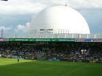 We headed through the city centre to Globen, an area of the city also known as and 6 stops on the T-bana from the centre. Globen is the name of the futuristic development consisting of a shopping centre, bars and restaurants, a hotel (where we were staying), the Soderstadion and the Globen Arena – the world’s largest spherical arena, and the main concert hall and indoor sports arena in the city. We checked into the hotel, and Lolly was very pleased to see that the Ljungskile SK team were staying there – and she decided to support them. Our hotel had an excellent view of the Globen, and the football stadium – it is always a rare treat to find a hotel so close to a football stadium where you can seek sanctuary until the last minute. In the UK some of the newer football grounds include integrated hotels such as Bolton’s Reebok that has a few rooms overlooking the pitch (although you don’t actually get any crowd noise when you are in your room watching it) and West Ham’s which double as Executive boxes. So 5 minutes later we were in the stadium, and fortunately under cover. The stadium is a strange design, and there is talk of them moving to a new one closer to the heart of their support in Hammarby around 3 miles to the east. It has one open end, with temporary seating, two single tier covered stands running along the side of the pitch and the final end that consists of 6 rows of seats with office buildings above. With sky’s darkening all of the time it was inevitable that the game wouldn’t be rain free, and those in the temporary stand would be soaked. Queue an operation of military precision by the stewards as they dished out free plastic ponchos to all of the fans. And what made it even better was the standard of the stewards. None of the English-style characters who either look like bored students, fat controllers or failed policeman – these were female, mostly blonde and absolutely stunning. Worth the admission fee alone!