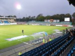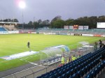 The bus deposited me in the centre of Trelleborg, a collection of nondescript buildings with a church in the middle (you can see I am a fan already) and I walked the fifteen minutes or so up to the ground, known as the Vangavallen, which is set in some nice parkland to the north of the centre. The rain had set in by the time I reached the stadium, creating a dull picture for me to view proceedings from the press area at the top of the tall main stand. The rest of the stadium is a mish-mash of styles. One open terrace area where the hardore fans would normally gather, but with the rain falling heavily most had opted to either stay at home or move to the main stand, which sat 6 foot above the pitch, meaning even the 1st row offered a good view. Opposite the main stand was a smaller single tier covered stand with eight rows of seats and proudly flying the flags of all the sponsors (and there are a lot – no such thing as real estate here on the kit!). The final stand is a temporary terrace that was closed off and only apparently used for the big games versus Malmo and Helsingborgs.