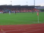 After a ten minute walk I arrived at the stadium and paid my 90DKR (about £8) to enter the ground about 5 minutes after kick off. First impressions of the stadium were not particularly good. It had one big covered stand that had around a dozen rows of seats and one temporary terrace of four steps on the other side. Behind one goal was a large grass bank where some fans were sitting enjoying the late afternoon sunshine and a beer. There was a small athletics track running around the pitch which didn’t really retract from the viewing positions.
