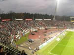 The stadium is a real odd affair. Once upon a time it had an athletics track, but this has now been partly replaced by the building of a huge main stand. The three other “sides” of the track still remain, meaning the fans in the uncovered curves behind the goal would not only get cold and wet for this one, but also had appalling views – especially those in the front row where a high fence also added to the view. The older of the two side stands was where the bulk of the Karlsruher fans congregated. This stand looked like a remnant of Landsdowne Road with a lower tier split into two , with standing room at the front in a paddock, then a small upper tier covering the upper part of the lower tier. Bremen had almost filled their corner of the stadium,and it was noticeable before the game how much of a friendly banter there was between the two sets of fans.