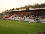 Certainly one of the better grounds in the Blue Square Premier and one which would not look out of place in the Football League. On one side is the all seated covered, Main Stand, that looks quite impressive. It is unusual in so much that at the back of the stand on either side of it, there are large gaps between the back of the roof and the stand below. Whilst in the middle of the stand at the back, there are a number of glass fronted areas to various Club offices. Opposite is the fair sized East Terrace, that is covered and is quite steep. Eventhough like the rest ground, the stand is relatively new, it does have a gable with a clock sitting on its roof above the half way line, which gives it a touch of character. At one end is the South Stand, which is another single tiered all seated covered stand. This stand given to away supporters. There is an electric scoreboard on the roof of this stand. Opposite at the North End of the ground, is a small covered terrace. A set of four new floodlights (one pylon in each corner) were installed for the start of the 2007/08 season.Thanks to Duncan Adam’s excellent site http://conferencegroundguide.co.uk/ for the above information