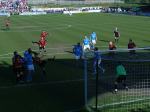 York were the visitors for the last day, and after a bit of squeekybum time in the past few weeks they secured Conference football with a 2-1 away win at Weymouth on Friday night. I had seen York on four occasions already this season and their performances had varied from solid (Histon), attacking (Burton Albion), defensive (Salisbury City) and woeful (Eastbourne Borough). Of course there was always the passionate support to look forward to. The York fans have supported their club through thick and thin over the past few seasons and are one of the only clubs to have a recognised “Ultra” following. Some of their fans can be a bit exuberant to say the least (see February 2009’s post on “I do like to be beside the seaside”) but at least they care and show a bit of passion. They have exceeded a number of expectations though this season. The form of centre-forward Brodie has been nothing short of sensational at times, and with 18 goals this season he has been their shining light. His goals also secured a first trip to the New Wembley Stadium for the club as they are due to play Stevenage Borough in the FA Trophy final in a few weeks.