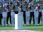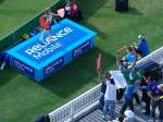 So after a sumptuous Oval lunch of grilled lemon fish (is there such a fish and if so does it look like a lemon,or does the fruit look like the fish?) we headed down to pitch side to see if we could get a look at the trophy. With a few minutes to the start of the game the plinth was taken onto the field but we could not see the burly security men who would undoubtably be guarding it ? Oh no – along comes a random bloke with a small metal box, the kind you keep your tools in at home and there it was – all sad and unloved.