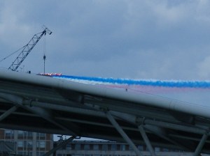 A Red Arrows fly by in the Twenty20 colours – nice touch