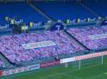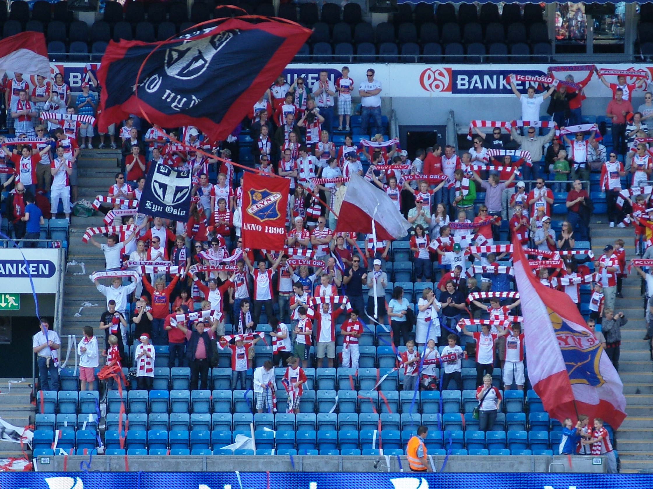 In the competition to find the most bizarre pre-team emerging ritual Lyn will take some beating. A strange devil like character ran out onto the pitch and high fived every ball boy in the centre circle and performed a couple of cartwheels whilst the stadium speakers boomed out the theme tune from 1492 – the whole 5 minutes of it. The teams finally came out with no more than 5,000 in the stadium. The hardcore Lyn fans were located in the lower north stand and banged their drums, waved their flags and generally got behind their team. The traveling Odd fans were in the east stand with the sun shining in their faces and facing the Carrot end – empty seats that had huge banners of crowd faces on as if to confuse the opposition.