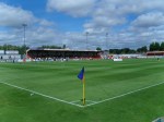 The ground is located on the outskirts of the town centre but well placed for local amenities. From the railway station it is a 15 minute walk. Exit the station and walk down to the traffic island. Turn left along the dual carriageway and continue to follow it, bearing around to the left at the next roundabout, which takes you past a garage. The floodlights and the red exterior of the ground can be seen in the distance in front of you.