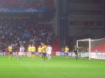 The second half improved slowly but seemed to come to life after APOEL’s Haxhi was cautioned for a silly foul on Hutchinson. In the fifty third minute the deadlock was broken as FCK’s attacking full back Pospech appeared unmarked at the far post to head home. The goal did spur APOEL into action and they came the closest to a goal all evening when Alexandrou went close. The away fans had been getting more and more upset with the linesman in our corner as they deemed some of his flagging a little excessive. Tempers reached boiling point when an arguement broke out over who should keep the ball that had ended up in the crowd and stewards had to intervene between two bear chested posturing Cypriots, full of testosterone and frustration. It was all in vain though as FCK came the closest to a second when a shot from the impressive Almeida hit the post and then in the dying seconds Haxhi committed another stupid foul and realised he was to get a second yellow. So he could just take it like a man, walking off without a second glance but he decided to take the Stephen Taylor (Newcastle United Centre Back v Aston Villa two years ago) approach and roll around on the floor as if he had been the injured party hoping the referee who have a change of heart. No such luck and he was off, much to the away fans anger.