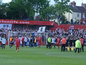 Blue Square Conference North is not known for its passion normally but when the Play Offs beckon then its a different story. The small Derbyshire town of Alfreton hosted a huge game with the home team on the verge of a promotion to virgin territory. a humdinger of a game, played out in front of a passionate full house. Seven goals, police dogs on the pitch and some “interesting” characters. What more can I say!