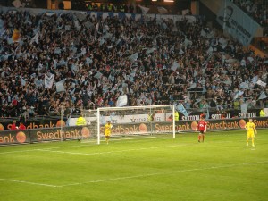 Sixty three minutes and that man Larsson was at it again, given a few yards in the box a-la- Michael Owen style to slot home his second. The north terrace responded by turning the noise up an octave and started bouncing – an impressive sight and one that had been missing on my previous trips. It wasn’t all Larsson though as Robert Ahman Persson (no relation to the great Eric), this season’s top scorer was a constant threat down the left hand channel and forced a couple of good saves out of Vaiho in the Djurgården goal.