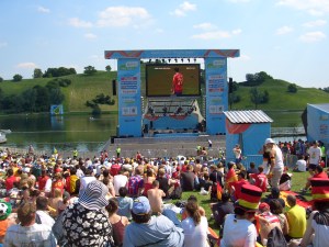 Our hotel was a typical Premier Inn style of affair. as usual we had to answer the same “yes we want separate rooms, and no we are not married” questions. We had passed a traditional German beer garden on the way to the hotel so headed back up there to watch France’s bore draw with Switzerland complete with a huge pork knuckle and lashings of beer, all served by traditional Bavarian buxom waitresses. This was no tourist place – we were in the middle of nowhere, surrounded by fields well off the tourist beaten track. However, it was an eye opener to see the locals let their hair down. The following morning we set off early, travelling up to the fantastic fan park at the Olympia Park. Here they had built a huge screen, floating on the lake which later would host over 70,000 Germans to watch the game between the hosts and Poland.