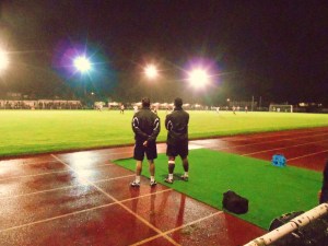 Hornchurch hadn’t really marketed the game much apart from on the website, and despite it being a foul evening the crowds had come in abundance. Over 1,100 in total – and hats off to the club for charging a sensible £5 for Adults and just £2 for kids. The one thing the ground doesn’t lack is seats under cover although sitting on the edge of an athletics track with virtually no incline isn’t ideal. The best views of the game actually came from the bar, positioned at one end on the bank, with a nice patio area – not that anyone could enjoy anything but the rain.
