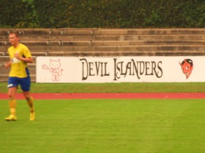 However, the main excitement for this game came from the visitors. Bornholm is an island laying in the middle of the Baltic Sea – in fact quite a way from Denmark. Laying closer to Germany, Poland and Sweden rather than Denmark the island boasts its own language, its own flag (the Danish one with a green line running through the white cross) and its own disease (Bornholm Disease which is also known as Devils grip). It is a favourite weekend destination for people from Copenhagen, who come to enjoy the peaceful surroundings and clear waters.