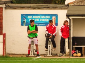 The rest of the first half was spent punctuated by the referees whistle. Both teams tried to get the ball down and play on a pitch that sloped away on the far side. Half way through the second half the Whitstable subs were sent to warm up. No stretching for them – oh no. Out came their Auntie’s old cycling machine and they hopped on for a quick warm up, ignoring the chuckles all around. However, it wasn’t them who were the laughing stock as Stuart Vahid, the Whitstable centre forward kicked air in front of an almost open goal when it would have been easier to score.