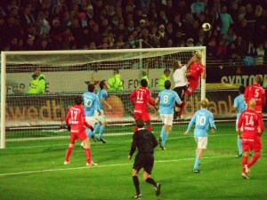 They had me on “of course”. But this season has been special for Di blåe. With just four games to go they went into round 27 with a 3 point lead over local rivals (and also a top club by the way) Helsingborgs IF thanks to the passionate win last month. With both teams kicking off at 7pm on Monday night, the right result could almost put the Allsvenskan on a bus down to Malmö from Stockholm where AIK had been hiding it in a cupboard. Helsingborgs were away to recent champions IF Elfsborg whilst Malmö were hosting Kalmar FF, themselves Allsvenskan Champions in 2008.