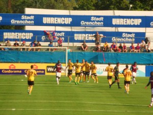 The second half failed to excite even the most placid Swiss man. Star of the show was Belgian Ruud Boffin in the Hammers goal who pulled off a number of excellent saves including one from close range from Mayuka who was left scratching his head as to how he missed. It was hard to pull many other positives out of the game. The sun shone, the setting was picturesque and after all it was only the first pre-season game. It’s not like they have more tough games coming up right? Only FC Basel and Danish Champions FC Copenhagen in the next ten days.