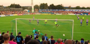 In fact as early as the second minute they should have been ahead when the very impressive Degen literally wandered through the middle of the Hammers defence and fired in a low shot that Ruud Boffin did very well to save. The couple of hundred West Ham fans in the stadium breathed out a sigh of relief but if they thought it would improve they were left disappointed. As the almost customary flags from Upminster and South Benfleet fluttered in the wind, and half a dozen or so parachutists slowly glided down to earth behind the stadium YB Berne took the lead. Schneuwly found himself in acres of space and had time to pick his spot in the corner of the net. The sound system blasted out a disco version of “We all love Young Boys” which those crazy Swiss sang along to whilst the West Ham fans pretended to look at their phones.