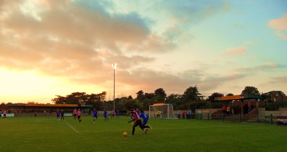 With the sun setting low over the ground and both teams forgetting that this was a “friendly”, the match made for a very interesting spectacle. There didn’t seem to be much between the sides with the ball being played through the midfield and out wide as and when a crunching tackle didn’t stop play. Chances on goal on the other hand were few and far between. Grays had the better of the earlier exchanges but it was Hornchurch who broke the deadlock just before the half hour mark.