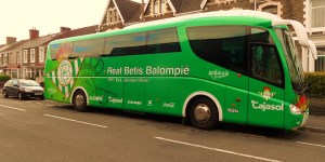 So after a day walking around waterfalls, I dropped the female Fullers back at TBIR Towers (Swansea branch) and made the short trip down the M4 and up the A483. I was worried that parking may be a problem with such a high profile game. On arrival it appeared otherwise. In fact it appeared I was the only one here. Perhaps it had been a cruel wind up by Mr Pitman, taking revenge for me editing one of his articles and somehow getting Neath in on the gag. But then I saw it. In all its majesty. Real Betis had brought a coach. Not just a coach borrowed from “Dave’s Coaches, Briton Ferry”. Oh no. They had their own, big green travelling machine, complete with logos, pictures and a Spanish number plate. Some poor sod had driven that 1,632 miles from hot and sunny Andalusia to wet Wales. That in itself is worth a round of applause.