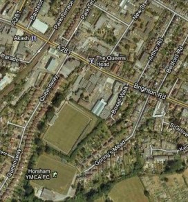 Horsham had two football grounds, which were the closest located in the Football pyramid in the whole of Great Britain. There – I step back in awe of the amazement in your eyes. Yes, we all know that the two Dundee teams are located on the same road, and the two teams in Nottingham are separated by the River Trent. There is also the strange situation with Northwich Victoria and Witton Albion, who built almost identical new grounds less than 250 yards apart, and today we have the grounds at Bedford and Totton. But these grounds were the closest of the lot. Alas the original Horsham ground is no more, consigned to the history books and a car park for a set of flats today.