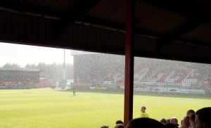 The rest of the half is not worth noting though. Nothing really exciting happens, although there is a summer downpour about half way through, which results in those on the only uncovered bit of the ground making a beeline for the sanctuary of the North Stand, or as it’s more commonly known the sieve. At times, we can barely make out our own goalkeeper, who is only just fifty yards away.