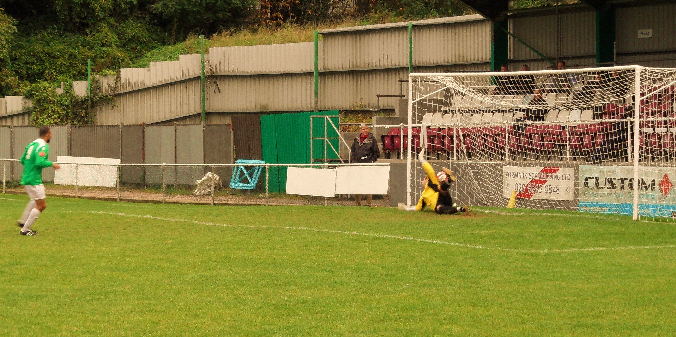 Time was ticking down and debate turned to whether there was replays or even penalties in the early stages of the FA Trophy. Time for one last attack and the be-gloved Whyteleafe Fabian Batchelor (gloves???? In October???? 6 days ago in these parts the temperature was 28 degrees!) sent the ball into the area. Greenford’s centre back, Nick Turner (Electrician) blocked the ball with his chest but a modest appeal from the home side saw the referee point to the spot. The defender was livid, lifting his shirt and showing us his nipple, which was to be fair looking inflamed. “Go on mate, take a photo, send it to the FA”. So I did, although I think they have more important things to concentrate on at the moment than looking at players nipples.
