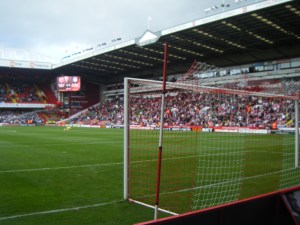 In front of the away following United keeper Steve Simonsen fell to his left to take a straight forward header by Madine, but then he just appeared to let go of the ball. Chris O’Grady pounced, but as Simonsen lurched towards the loose ball O’Grady hit keeper and post with his shot. A minute later and the Blades won a free kick in front of the home Kop. A perfect delivery by Lee Williamson to the near post and Ched Evans placed a perfect header in at the foot of the post. Cue more mayhem, but history shows that leads can be thrown away on these occasions and as much as you enjoy the moment, you don’t necessarily enjoy the rest of the match.