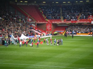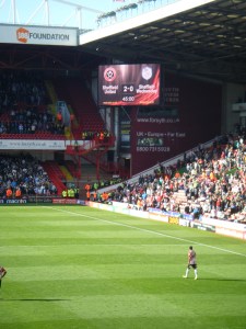 The first goal came with United’s first real clear cut chance, Ched Evan cutting inside from the right side of the box and firing in a low shot which deflected off Owls’ defender Rob Jones foot and on to the post. Stephen Quinn made a timely surge into the box to meet the returning ball and guide in the rebound. The celebrations were intense and manic, the hugging of strangers, hugging of mates, hugging of family, losing all bodily control until light headed fans flopped back in their seats. After a not altogether convincing start the Blades fans were lifted, a mood lifted by the fact that many firmly believed that United had to score first to get anything from the match. United were to increase the advantage, but not before Wednesday were gifted and missed a great chance to equalise.