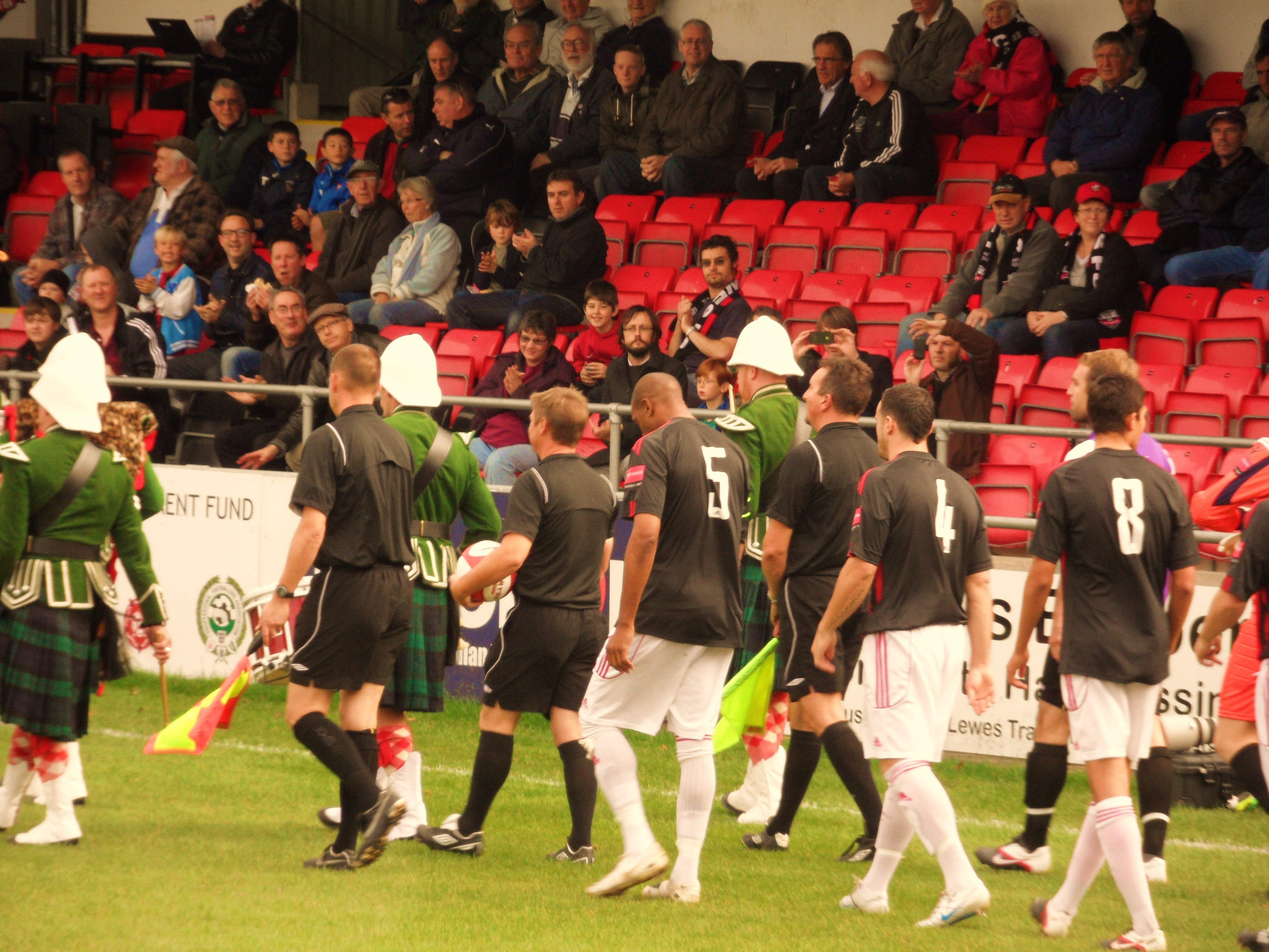 The game was also part of the celebration of Lewes’s Bonfire celebrations, with many of the crowd coming in their “pirate/smuggler” outfits (they are one and the same to be but apparently there is a world of difference), and a promise of a half time penalty shoot out to determine the best society.