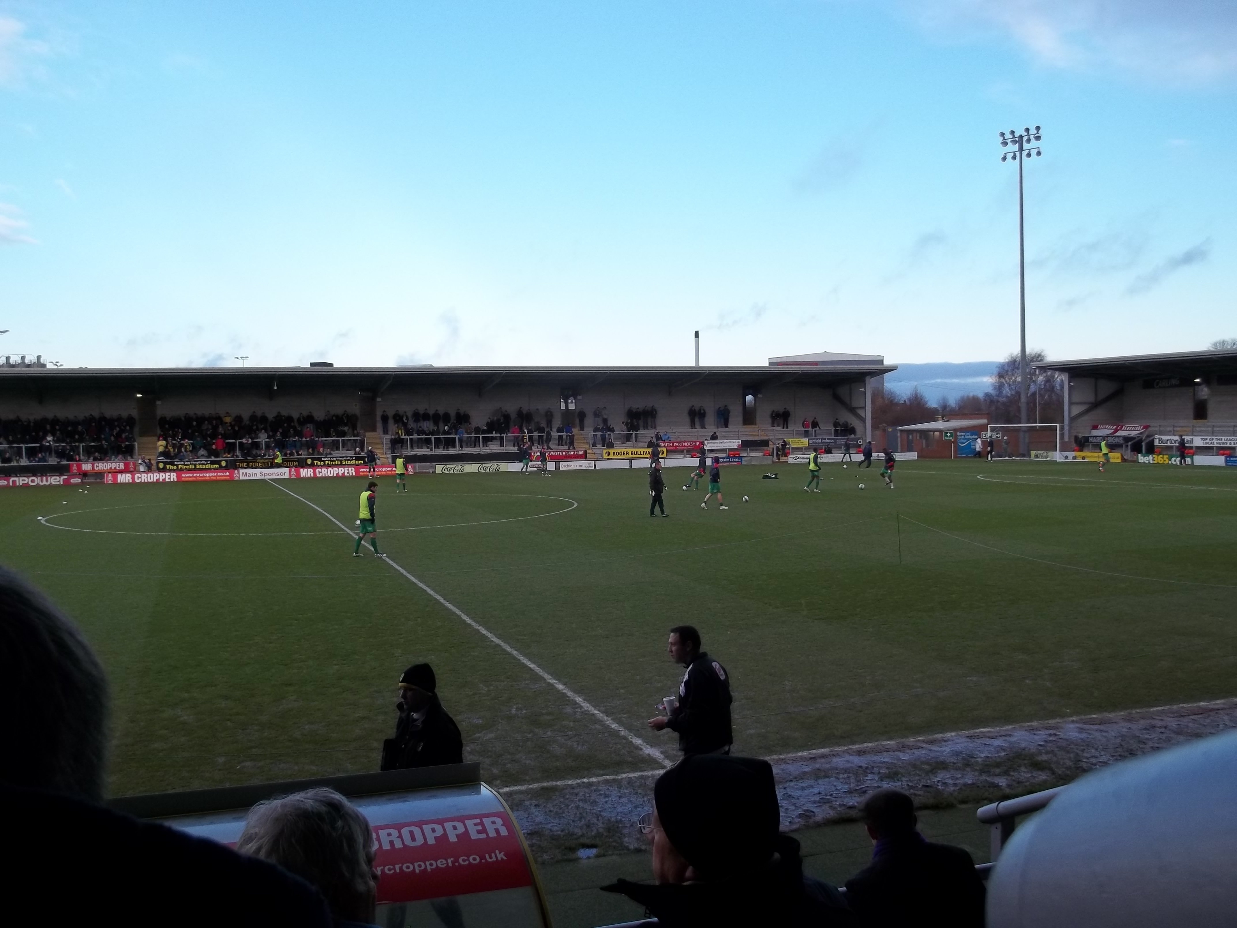 Leaving Victoria Road in the frost at 10.15am, we arrive at Burton just over three hours later with it still cold, but now cloudy with the hint of rain or even snow in the air. It has certainly affected the choice of clothing for some of our fans; even Graham, who normally only has a couple of layers on for most of the winter months, has got his coat and hat. If that happens, then it must be cold.