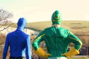 As I cheered from my lofty position I saw a flash of green out of the corner of my eye. I turned my head quickly to the side, but saw nothing. Then again, but from the other side of the mound. I must have been seeing things, with Northern Rachael’s punch from New Year’s Eve now taking on hallucinogenic properties. But no – straight ahead of me panting as he climbed the final few steps was a man (I think) dressed as the Green Hornet, complete with mask and yellow gloves with flashes on. He was followed by a man (again I think) with a blue full body suit on. They looked at me, I looked at them and then they turned, pulled out a video camera and started shooting a make-believe super hero action scene. Two’s company, three’s a crowd so I left…