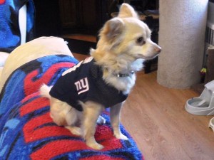 We arrived at the “Frat House”…It might as well have been called Delta Pie Gamma or the like. Huge (and I mean 72 inch huge) TV, everyone decked out in Giants clothes, food coming out of every crevice. The house even had its own bar downstairs, and one bedroom was accessed via a secret bookcase. This was the ultimate man’s house. Every gizmo and gadget could be found, and even the pets (a dog and a one-eyed hairless cat) had dressed up for the Super Bowl.