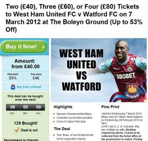But today I was very surprised. West Ham were the “deal of the day” and before anyone says it, yes it was a slow new offer day. Tickets for West Ham v Watford (7th March 2012) were £40 for two (and £60 for 3, £80 for 4). As if that wasn’t enough to entice you in, the highlights included the fact it was “Close to Upton Park tube”. I am aware of the offers the club has been involved with so far in 2012 – discounted tickets for buying pizza in Dartford and leaflet drops in Charlton Athletic and Millwall supporter areas to name just two. But is this the right move for the club? And what are the issues of going down this route? To me it is three-fold.
