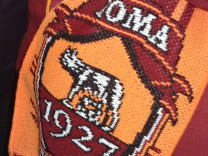 Disappointingly, the “sell out” actually meant that for safety reasons some 15,000 seats would have to remain empty, most of them in the stand opposite us. Quite what the atmosphere would have been like with those extra seats taken is nobody’s business. The club hymn, “Roma, Roma, Roma” started and most of the stadium rose as one. The song was the cue for the pyrotechnics and banners from either side. At some point the teams came out, but for once the focus was on the fans and not the players. The time for singing was over.