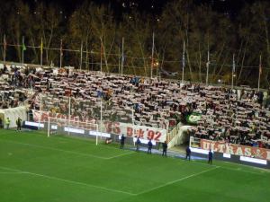 While the first half doesn’t have too many chances for goals, the atmosphere has been excellent, and is probably the best we have experienced in Spain so far. Given that the attendance is announced as just over nine thousand, the noise levels have been good, particularly from those behind the goal. This is even more of an accomplishment given that their stand is the only uncovered section of the ground, and although the noise would normally disappear upwards into nothingness, tonight it just seems to hang around. The mock fights amongst themselves (as well as their random bouncing and other routines) give cause to more than a few puzzled looks amongst Dagenham Dan and myself, as well as a few others, clearly unused to what is happening.