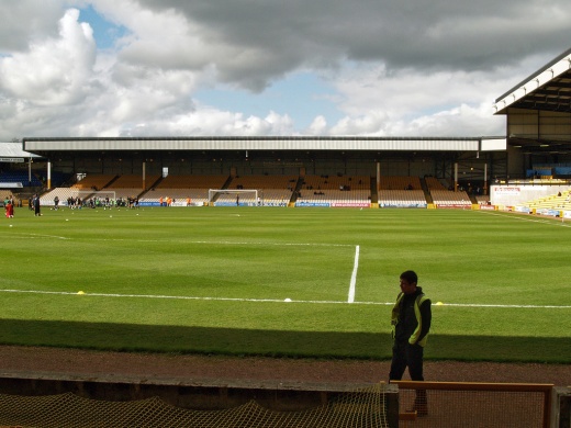 Having arrived at Vale Park around half past one, quite a few of those who had travelled up walked back for about five minutes to the Bulls Head pub. For those of us who stayed in and around the stadium, a walk around the ground bought us out to the home team’s training pitches, which looked in good nick. A lone woman was walking her dog around the Bycars End of the ground, and while she strolled on, the dog lagged behind, pausing only to cock a leg against an outside wall, and decorate it.