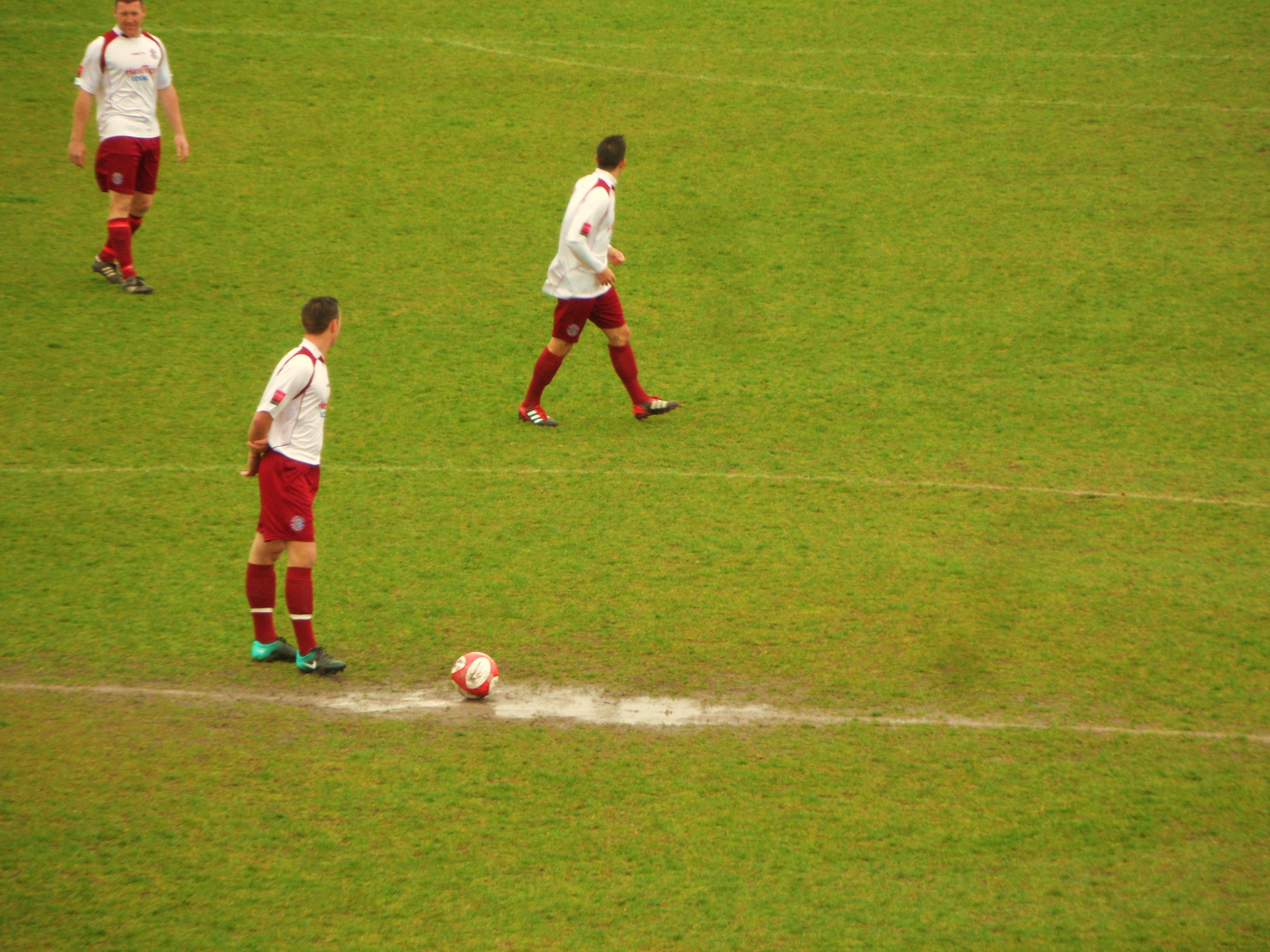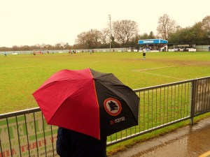 Whilst the weather made it difficult, Hastings seemed to use it as an excuse to make the tackles a few seconds too late. The referee needed to grab a drink after just ten minutes as he seemed to be hoarse with all of the whistling. But after issuing a yellow card in the eleventh minute against a Hasting’s player the resultant free kick led directly to the opening goal. Matt Somners long free kick caught everyone out and despite Nathan Crabb and Ian Draycott desperately lunging at the ball it appeared to go straight in the net. With a quorum of the board standing on the Jungle acting as the dubious goals committee we determined this as the fair decision (and nothing to do with the fact that Crabby is on a goal bonus). Danny Last, with Golden Goal time 11 minutes was also denied a certain £25 by the referees delay in booking the Hasting’s player and demanded we talk to the Referees Assessor at half time.