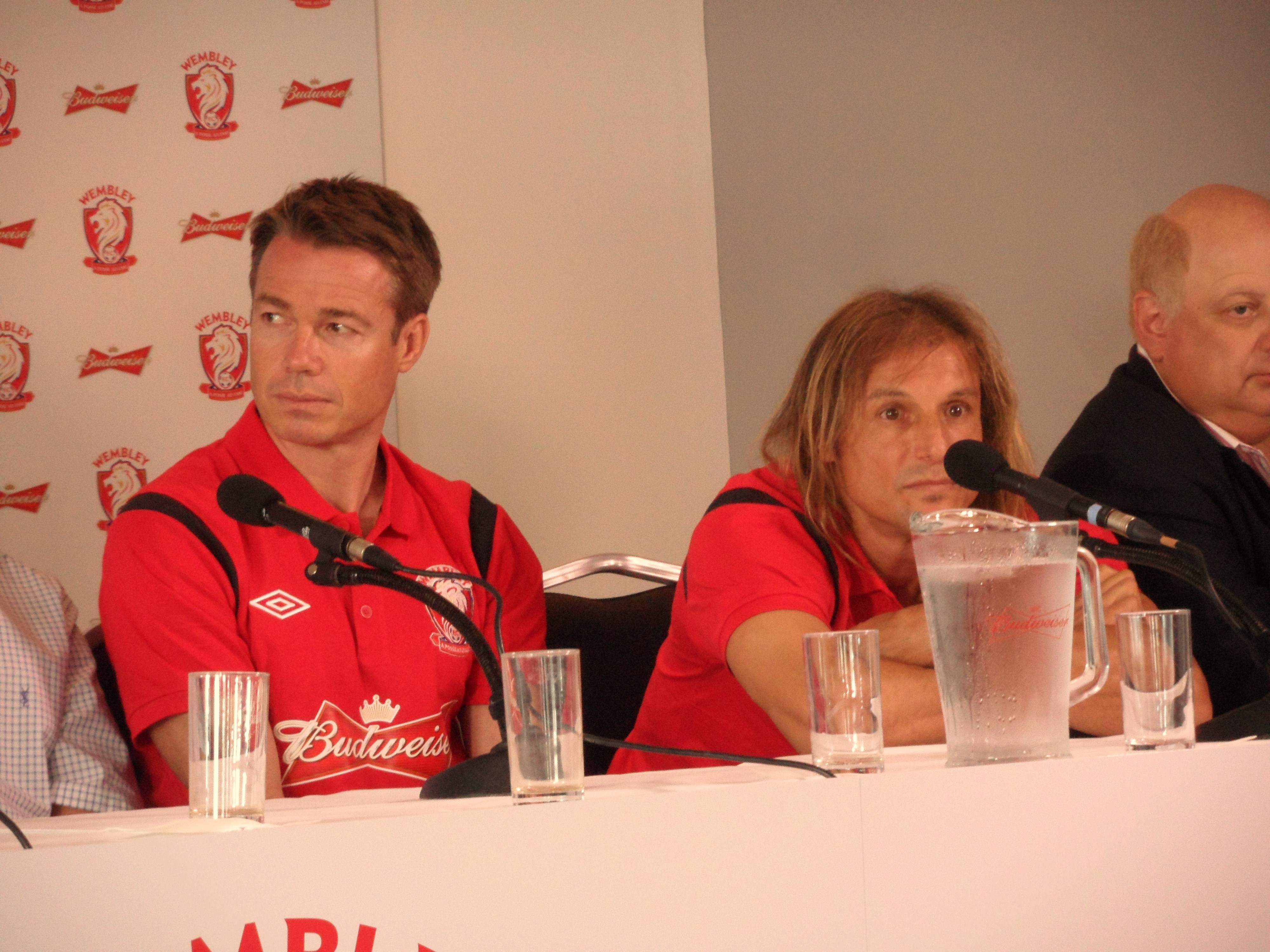 Around 1.15pm the top table is filled. Eyes move from the stunning blonde in her Budwesier red dress to the assembled ex-professionals. Introducing them as “legends” may be stretching it a bit far but David Seaman, Ray Parlour, Greame Le Saux and Claudio Caneggia certainly raise an eyebrow in the room.