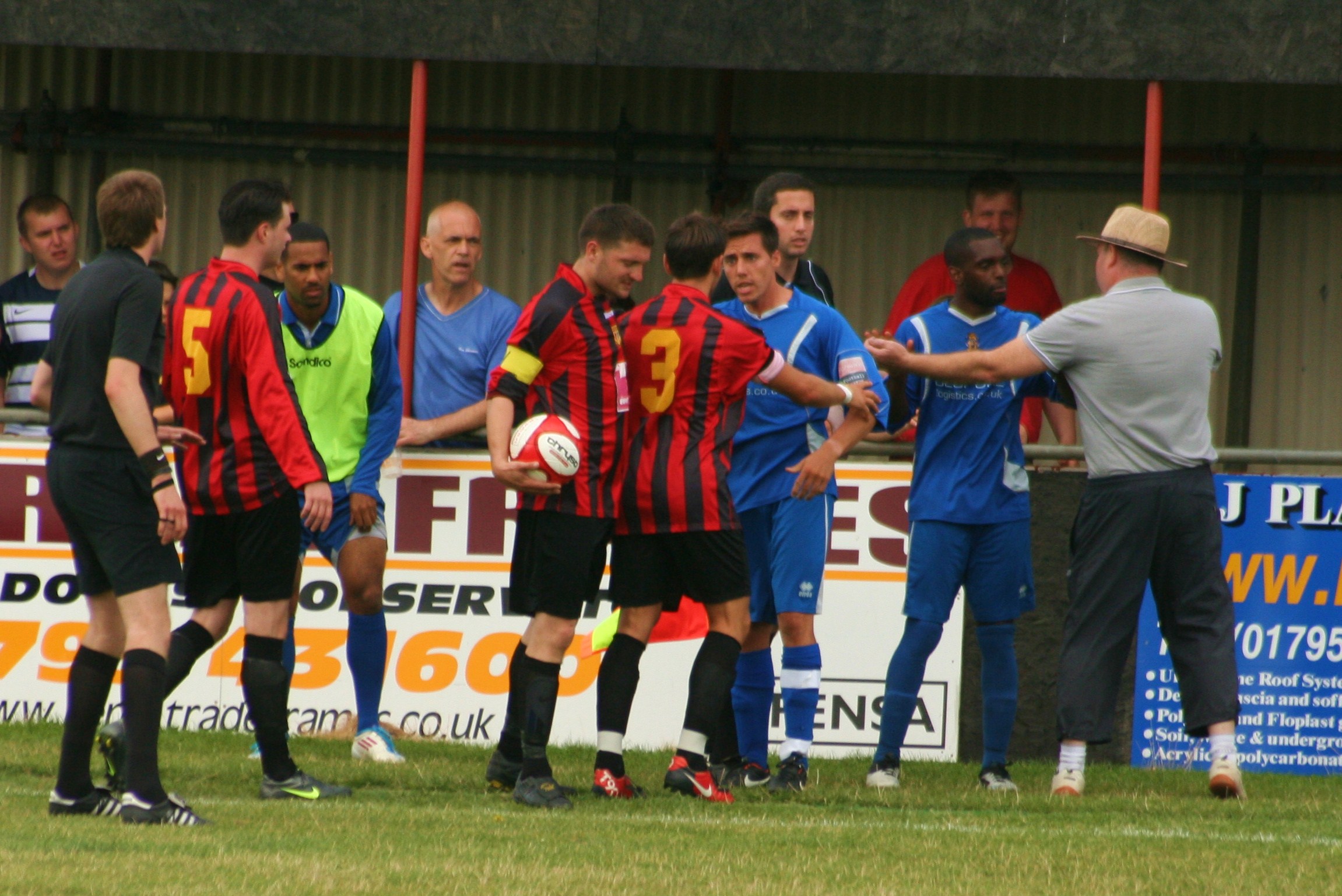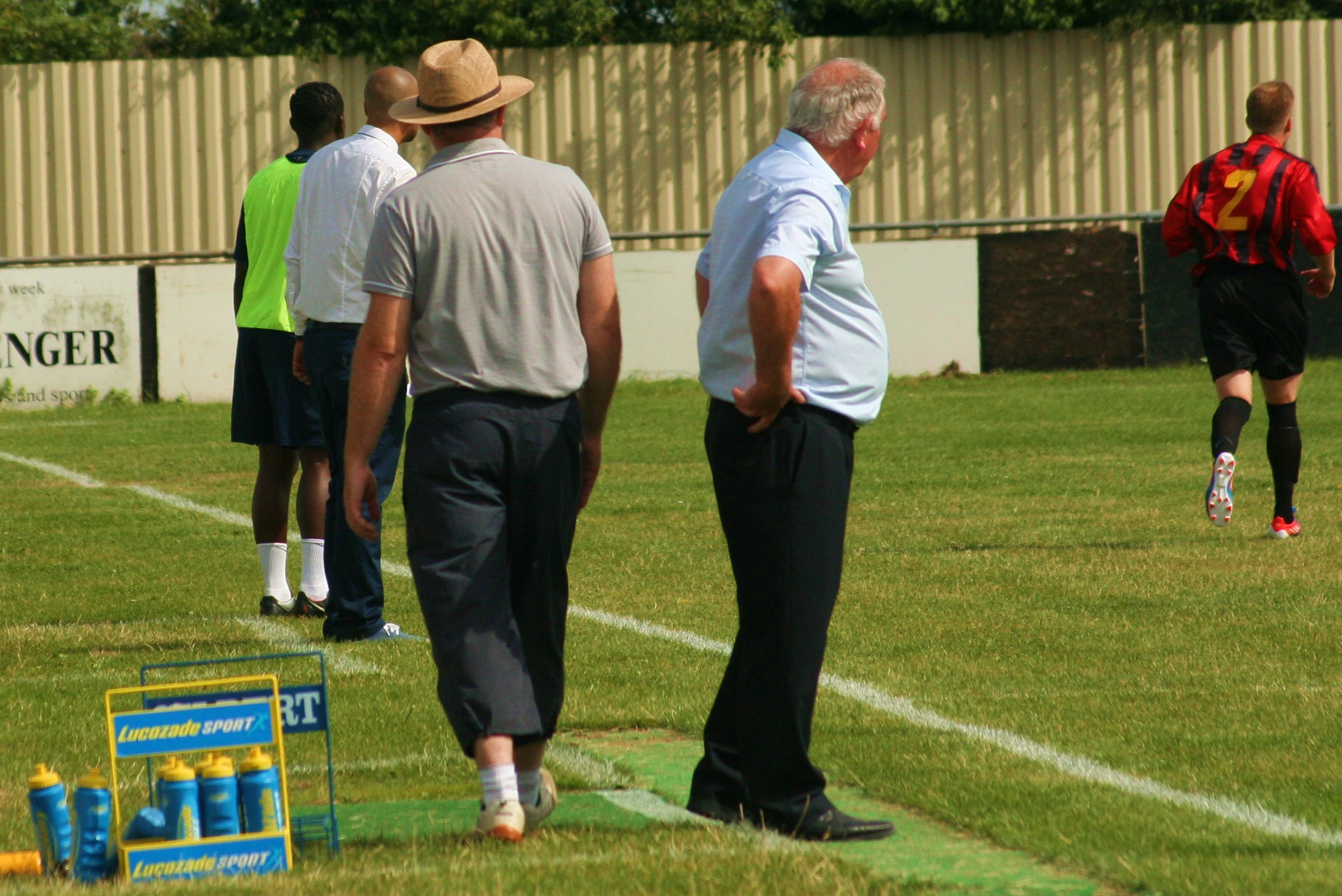 First off, “hats off” to one of the Ward brothers on the Sittingbourne bench. It takes some bottle to pull off a Panama Hat/three-quarter length shorts look but he went for it. As well as the dapper Aveley manager, the visitors also had a physio who thought it was acceptable to wear hot-pants and tights on the bench.