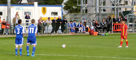 The home of Welsh Premier League side Carmarthen Town, Richmond Park is no stranger to hosting low-key international and European games and the usual band of volunteers were sufficiently fluorescenced-up to welcome the visitors and the suited councillors of the Football Association of Wales. Traditionally one of the more progressive clubs in the Welsh Premier League, ground improvements are noticeable with each visit and the stadium offered a worthy venue for such a fixture. Free admission proved attractive to the locals and something Carmarthen and other South Wales clubs in the Welsh Premier League could learn from as they look to improve on generally falling figures through the turnstiles, the second-sell making up for the loss of hard cash on the gate. With the anthems and customary handshakes passing without controversy, referee Bryn Markham-Jones, a well-known figure in the Welsh Premier League, signalled for the match to start.