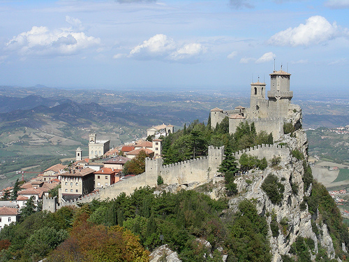 This was the third “leg” of my trip and so far I had seen two heavy defeats for the underdogs, firstly in Vaduz as Liechtenstein had been spanked by Portugal, and then Malta had been humbled by Denmark. I arrived in Rimini with hope in my heart and Euro in my pocket. Rimini likes to think it is the Cannes or Marbella of Italy. But on a cold morning in November it just looked like Skegness on a bad day (is there a good day in Skeggy?). Even the most ardent Italian Lothario looked like Sid James in Carry on Girls and there was no sign of the famous Italian supermodels in their teenie-weenie itsy-bitsy swimwear. Fortunately I was not staying long and my carriage awaited me. Well, a local bus that whisked me through the Italian countryside and up, up and further up until we broke the clouds at the border with San Marino, a little less than 10 miles from the Italian Coast.