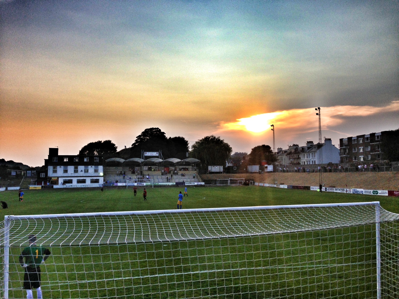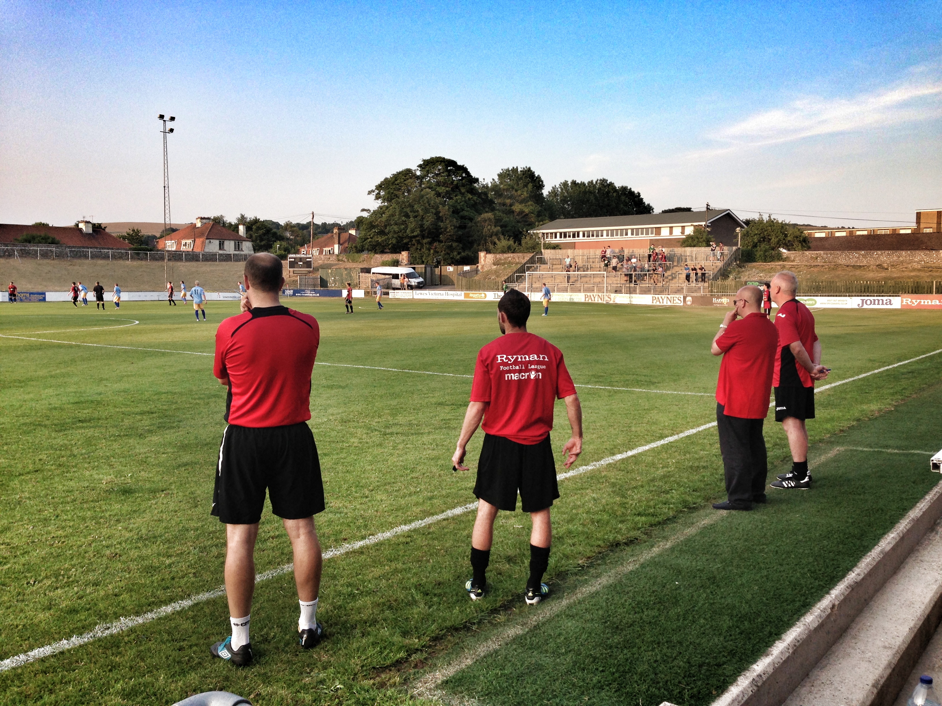 A pretty good crowd of 330 watched events unfolding both on the pitch as well as behind it where the grassy tranquil meadow of the Convent field was being converted into a venue fit for gentlemen…Mumford and Sons to be precise who will be “rocking” Lewes this weekend. Optimism the latest drug on the grassy knoll. Players warmed up in the sunshine as the fans tried to put names to faces of the new players.