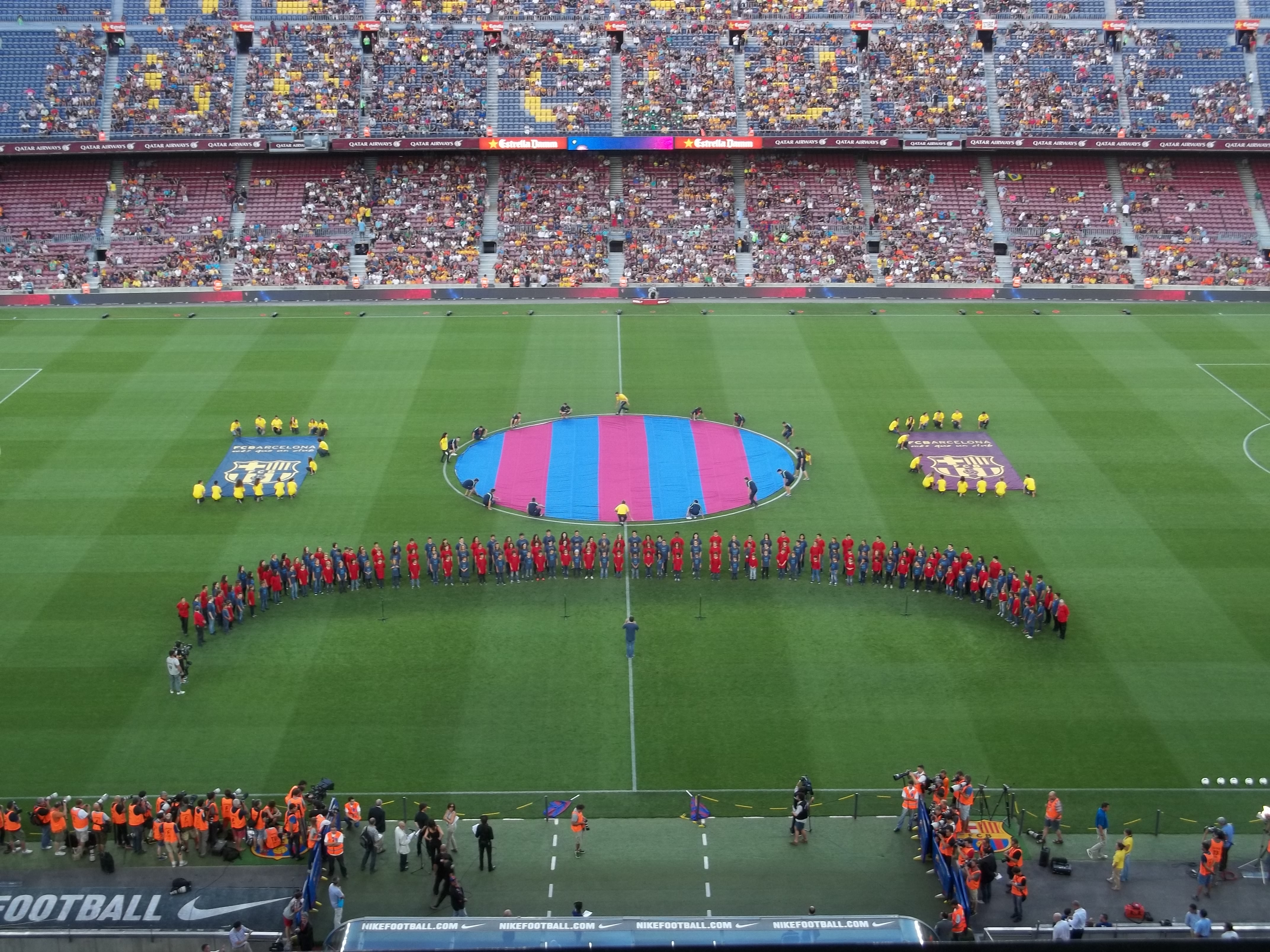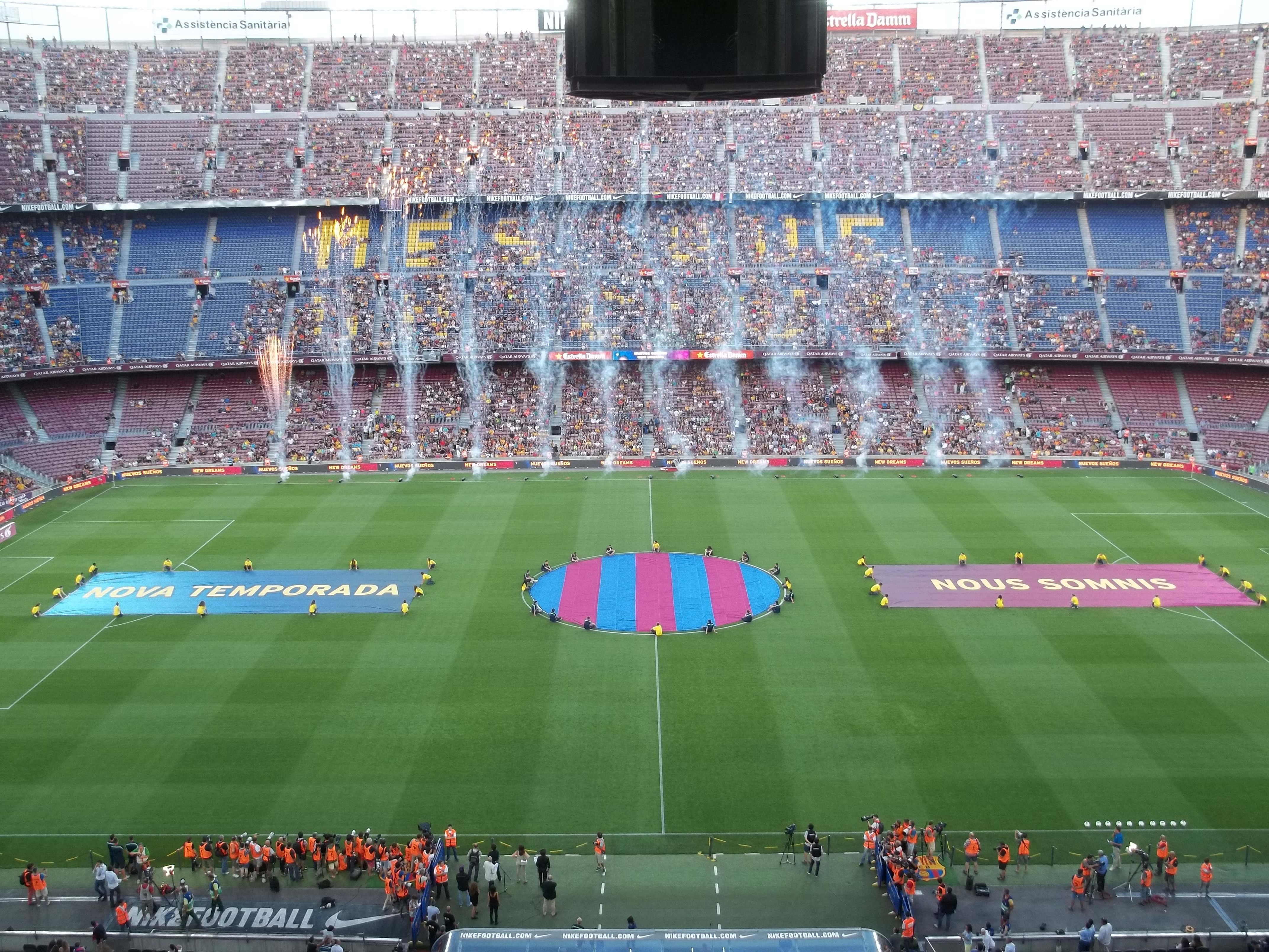 The stadium is not full as the game kicks off (which follows a tribute to Antoni Ramallets, who played for Barcelona for fifteen years, and whose name in printed on the Barca goal keeper shirts for the night), although the new kits are very much in evidence from a glance around those in the arena. The away shirt looks the more popular, given a cursory glance around the arena; based on the Catalan flag, it looks like it is another political statement from a club that seems to be pushing itself more and more towards the front of a movement that is pushing for independence from Spain. Whether that is a good idea, I don’t know, and the people of Catalunya will have to make that decision. It’s a different environment in Spain to that here in the UK, and I am quite pleased that our clubs aren’t as political as they can be in Europe.