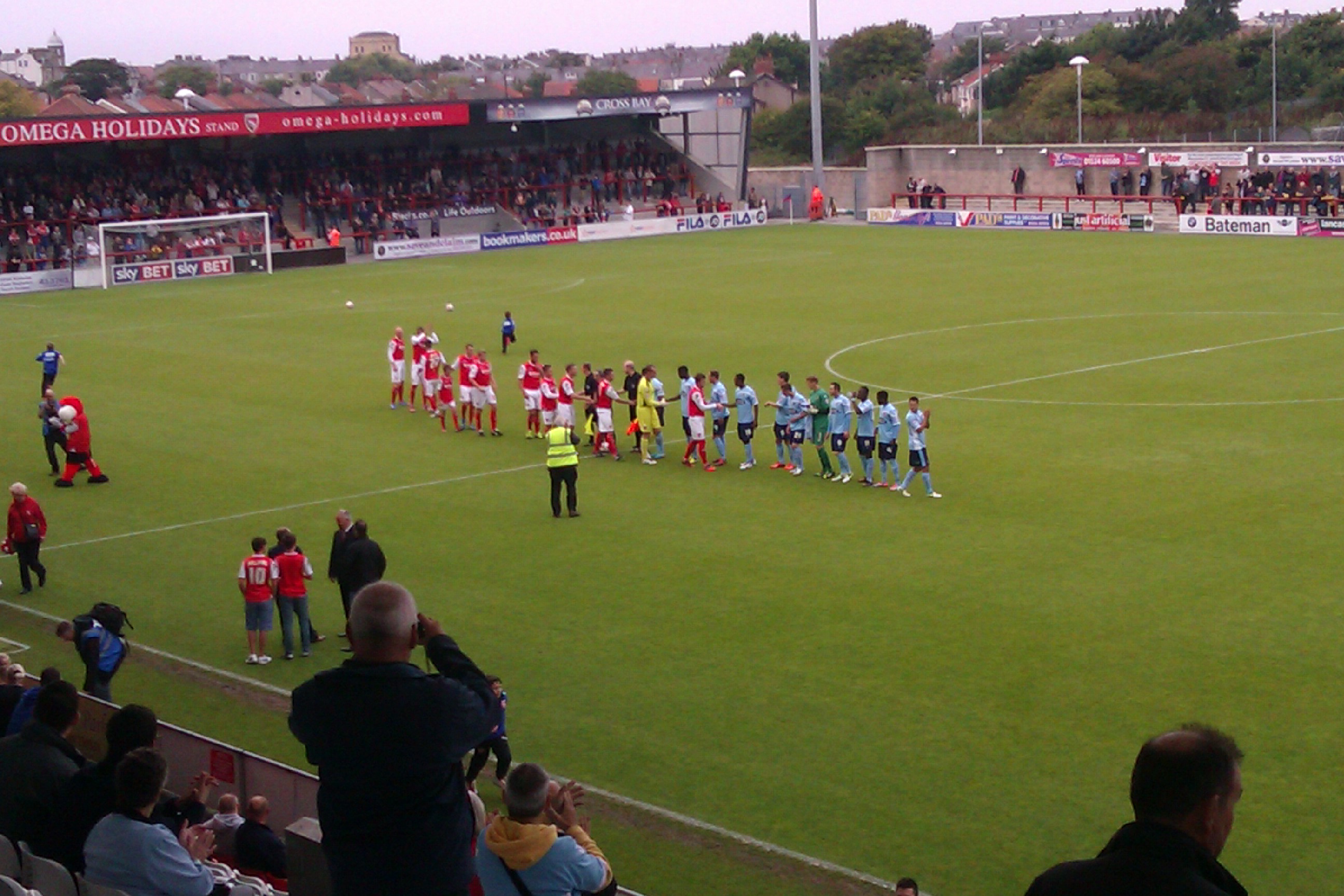 In May 2010, we played in the last game at Christie Park, in the League Two play off semi final. As the mist rolled in towards the end of the game (bringing momentary thoughts of the game being abandoned), the final whistle was blown, and almost instantly there was a wave of fans from the other end of the ground running towards to us. Our jubilation at progressing was instantly turned to trepidation as to what was about to happen, but with thirty yards to go, they just starting sliding on the ground, and congratulating us on winning. Relations between the two groups have always been good, stretching back to our conference days, and hopefully that will continue today.