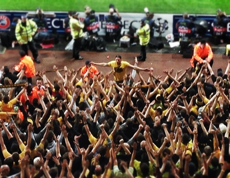 “Meanwhile, in the away corner” – As the Arsenal fans trooped off into the night, the party was just beginning in the away corner. The Dortmund players came to salute the crowd, who had been magnificent. But they didn’t stop at the barriers. They hopped over those, and walked along the front of the stand high-fiving as many fans as they could. Some players took off their shirts, throwing them into the mass of yellow and black. And when each member of the squad had done this, the lined up facing the fans and saluted them. We don;t see the same affinity between fans and players in England. Players simply view fans as an inconvenience in many ways, yet here it was clear to see that all of the Dortmund players had bought into the ethos of the fan being at the centre of the whole club.