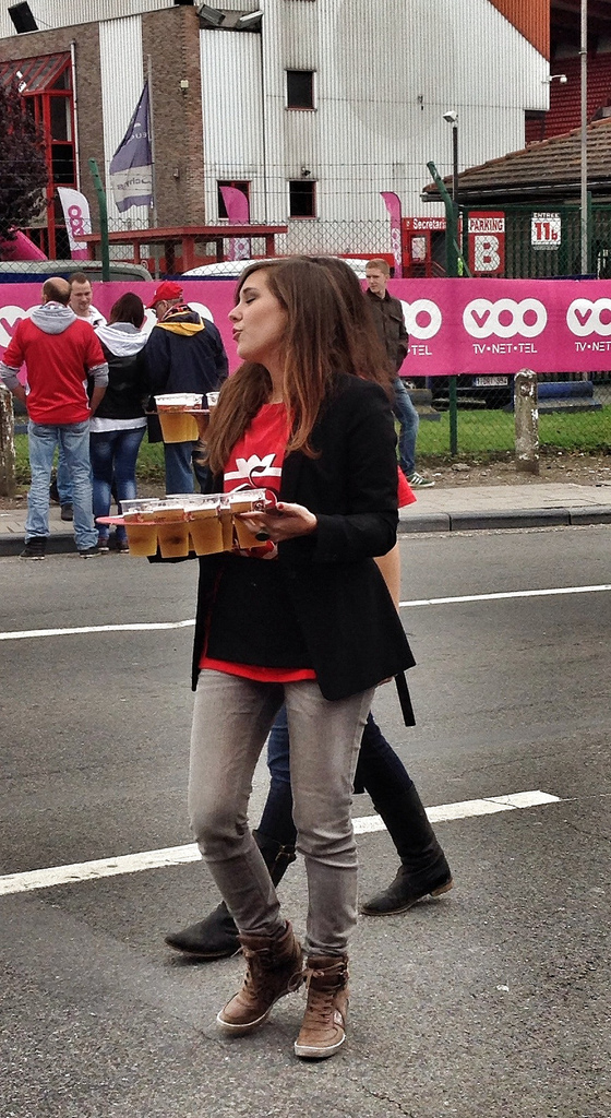 Despite hundreds of fans flooding into the bar, service had been nailed down to a tee. A group of young girls roamed the room, looking for vulnerable beer-free fans and pounced on them to take their orders. We all had our favourites and were willing to wait that extra time until they could serve us. Outside the bar fans had taken over the road and the girls out there had their wares on brazen full show. Girls, carrying trays of €2 beers in the middle of the street? What will they think of next.