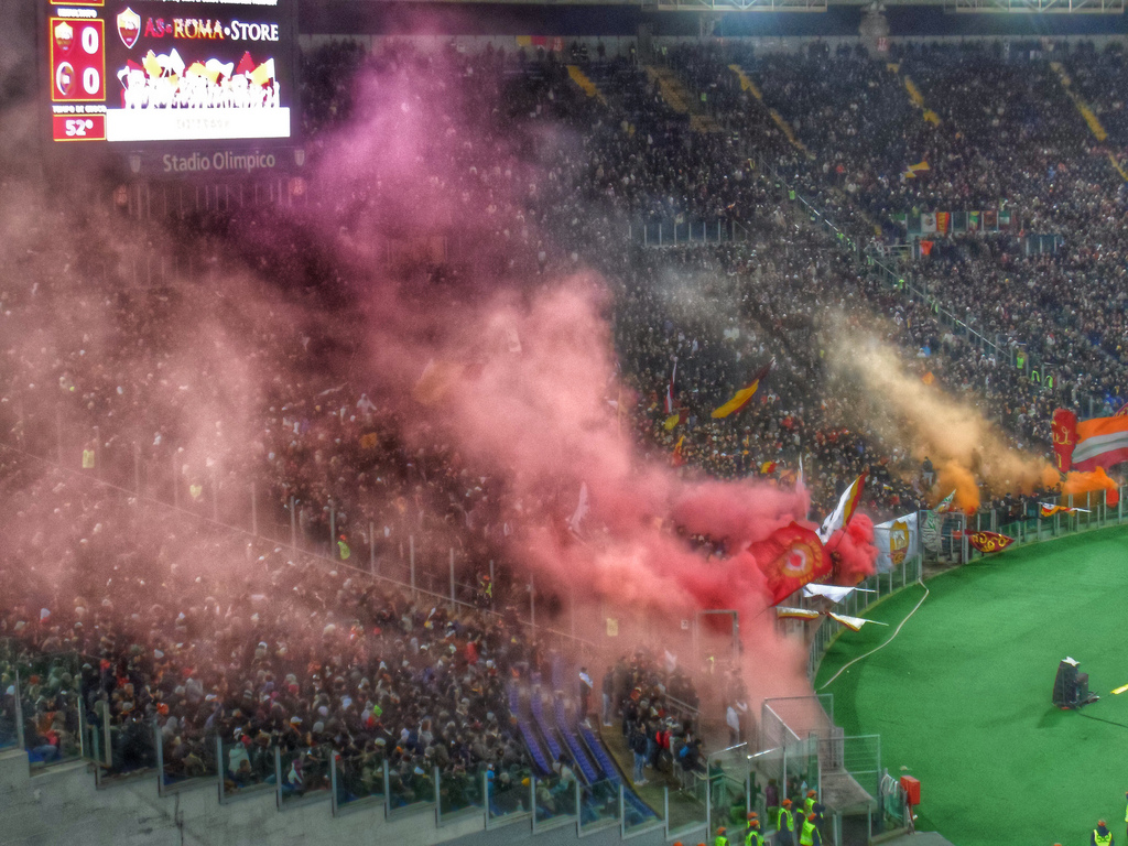 It was nearly match time. We had the choice of around 10,000 seats in the Tribune Tevere so like Goldilocks we tried a few, both right at the top of the stand, and down at the bottom before settling on one in the middle just in time to see the Curva Sud explode into sound, colour and smoke to welcome the two teams.