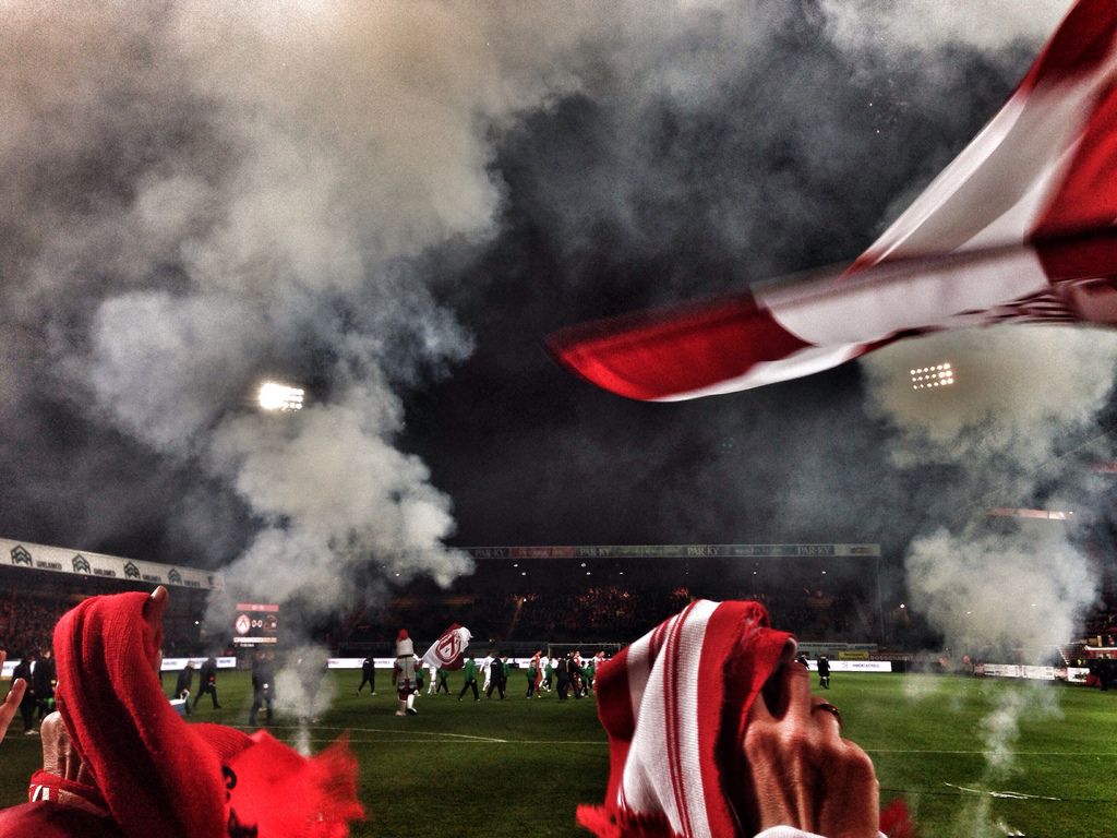 Thousands of fans, dressed in red and white were preparing to march to the stadium. And by preparing I mean firing flares into the air, throwing fire-crackers on the floor and twirling their scarves like there was no tomorrow. It was the best night ever. Danny and Damon aren’t easily bought but put them a beer in one hand and the chance of a flare in the other than they are anyones. As the sensible one in the group I went and got the car and drove it to the Guldensporonstadion and waited patiently for their three rings to say they had safely arrived.