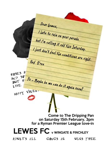 The latest postponement, the fifth in succession, means that the club have played just two games at the aptly named Dripping Pan since November. Somehow, somewhere we have to fit in nine games that have now been postponed. Lewes aren’t the worst hit team by any means – Grays Athletic have played four games less than us and are still in the Ryman League Cup.